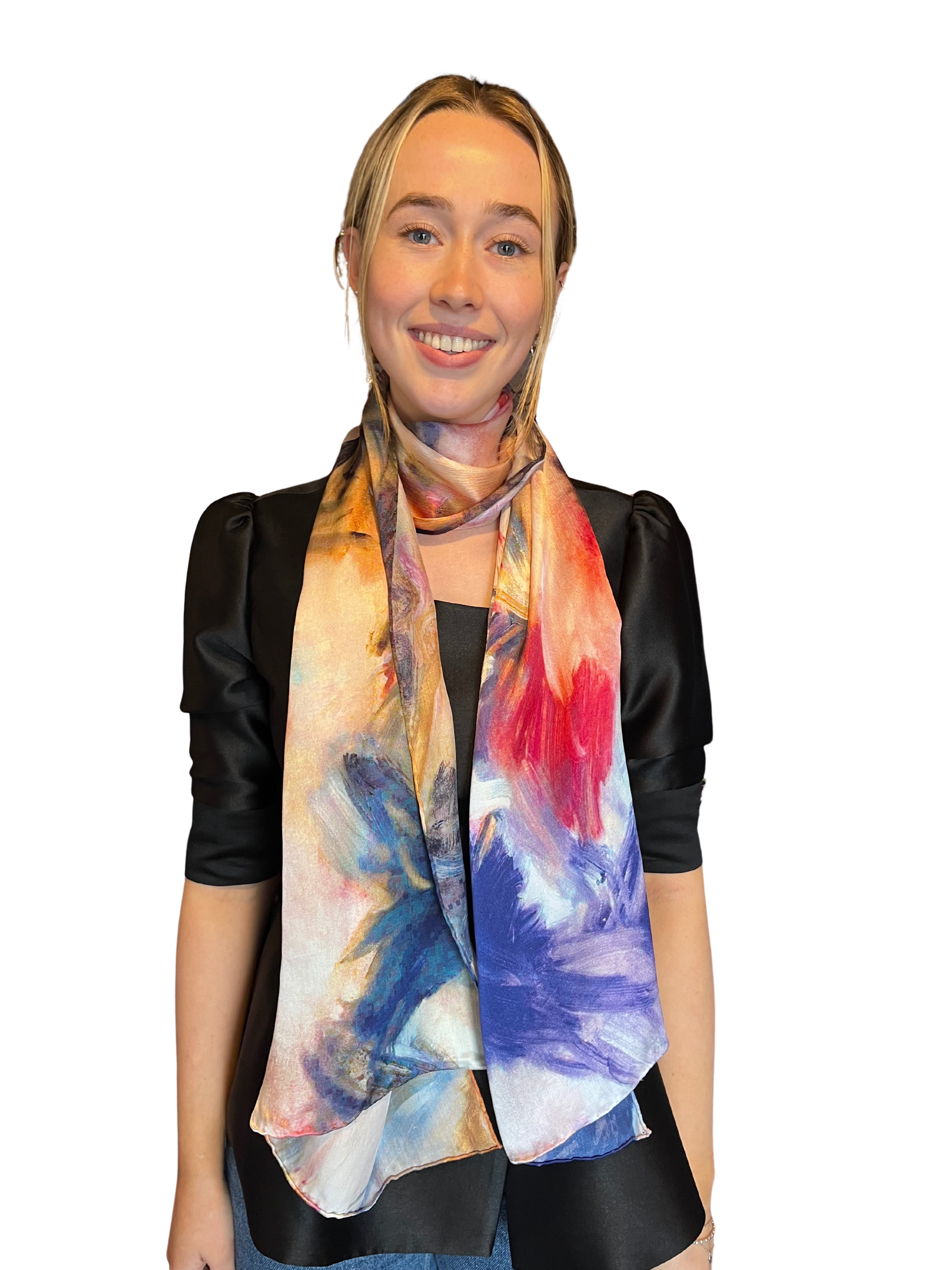 100% hand-rolled silk scarf with a vibrant swirl print. This scarf is also wide enough to be worn as a shawl.