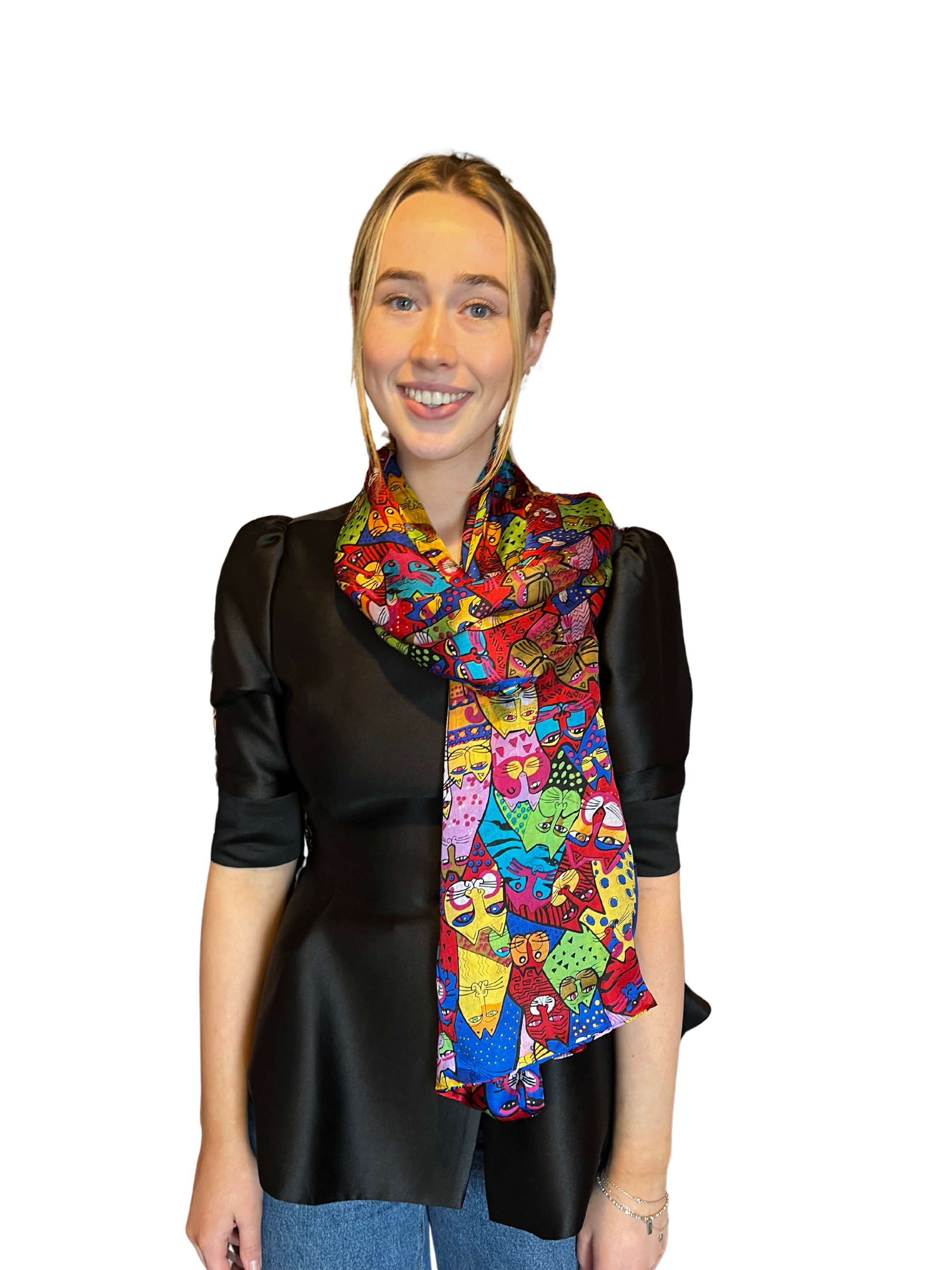 Vibrant 100% silk double-layered scarf featuring a colourful cat print. This scarf is also wide enough to be worn as a shawl.